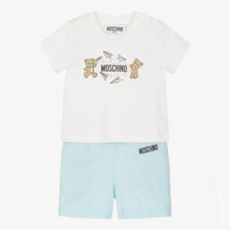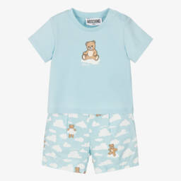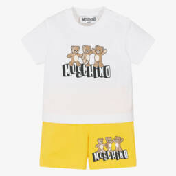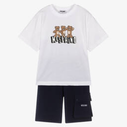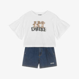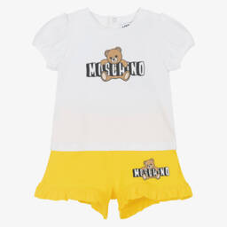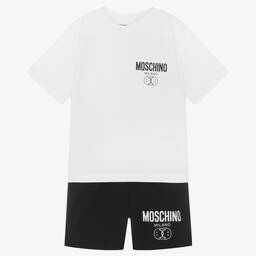 Black cotton jersey shorts set for girls by Moschino, featuring the Italian label's iconic Teddy Bear logo motif. Ideal for comfortable casual wear, the top is styled in a relaxed boxy fit and the cycling shorts have a gently elasticated waistband.