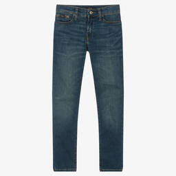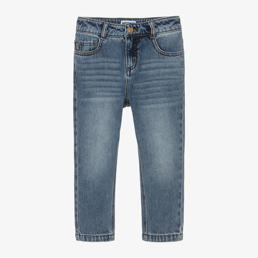 Blue denim Mini-me jeans for girls by Moschino Kid-Teen, inspired by the adult collection. They are styled with a washed look and have a straight fit. Fastening with a Moschino Teddy Bear gold button and zip on the front, they have an adjustable waist for comfort.