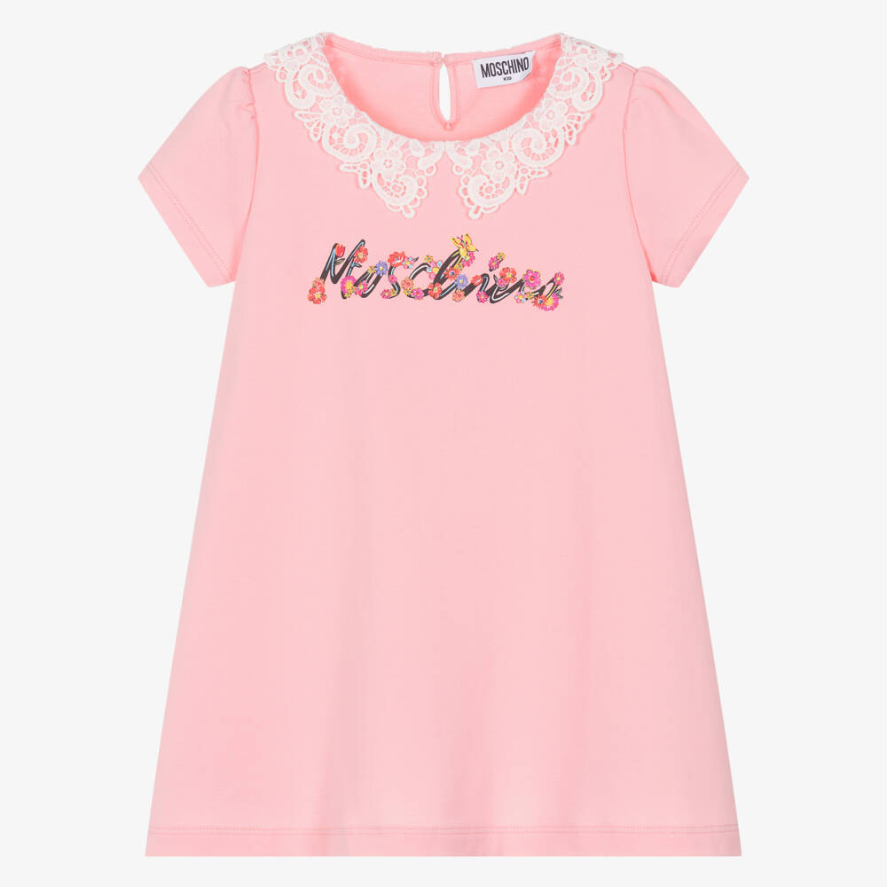 Pretty pink cotton jersey dress for girls by Moschino, printed with a colourful floral logo motif, for instant designer appeal. Simply styled in a flared, A-line shape, this comfortable dress has a beautiful guipure lace collar and a keyhole button fastening on the back.
