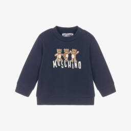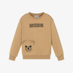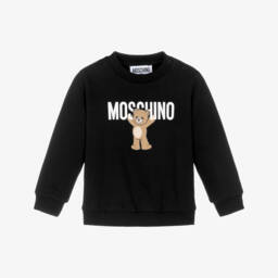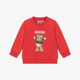 Girls bright pink cotton sweatshirt by Moschino, with the Italian label's Teddy Bear logo printed on the front, holding a sparkly, sequinned heart. Both casual and comfortable, this crew neck style is made in soft, mid-weight jersey.