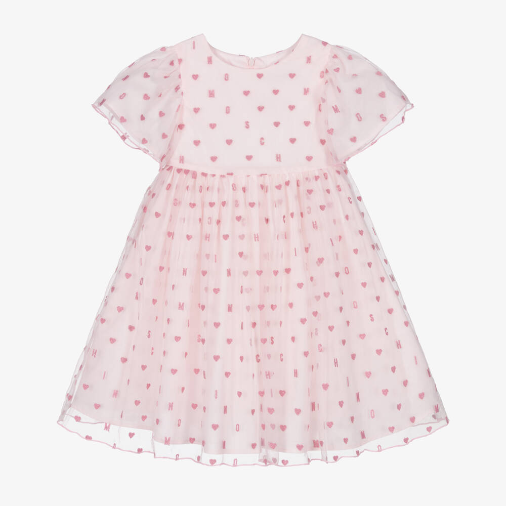 Girls fabulous pale pink party dress by Moschino, glittering with hearts and logo letters in contrasting pink. Ideal for any special occasion, it has a beautiful silhouette, with full, gathered sleeves and a coordinating skirt. It is made in super-fine tulle, with a double voile lining below for comfort.