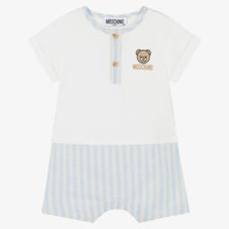 Cute pale blue cotton shortie for boys and girls by luxury designer Moschino. With a white Peter Pan collar, it has the brand's adorable, signature Teddy Bear motif on the front, with a duck and a lucky four leaf clover. Ideal for warm days, it is short-sleeved, and made in beautifully soft jersey that is both lightweight and comfortable.