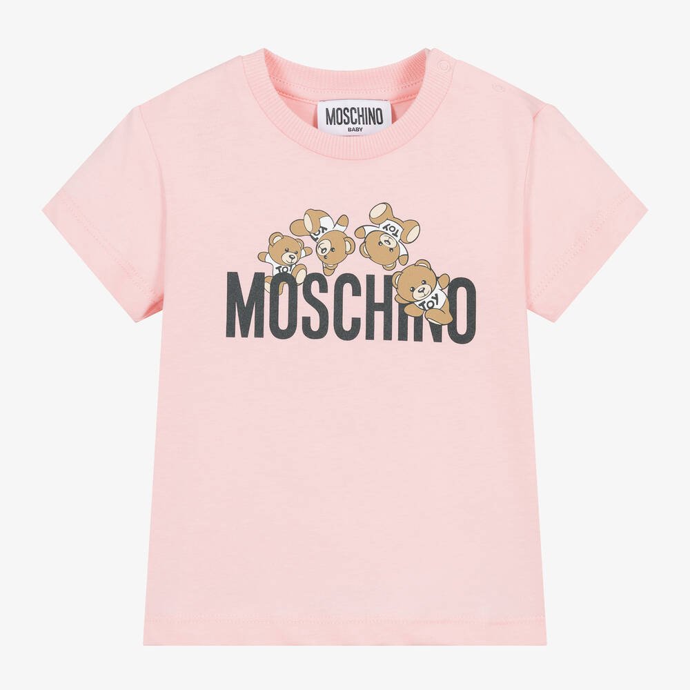 A pink short-sleeved T-shirt for little boys and girls by Moschino Baby, made from soft cotton jersey. This casual tee has a black logo print on the front featuring four tumbling Moschino Teddy Bears, for a cute designer finish. It has a stretchy ribbed neckline with popper fastenings on one shoulder to help with dressing.