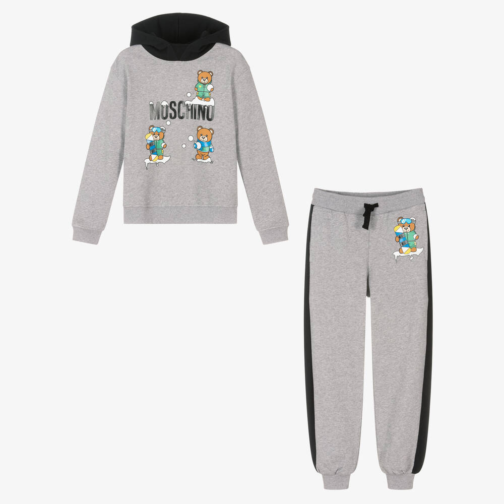 Teen boys grey and black tracksuit by luxury Italian designer Moschino Kid-Teen. The top has a fun winter-themed Moschino Teddy Bear logo print, with a black hood and black stripes. Made in soft cotton jersey, the matching joggers have a drawstring waist for a good fit and useful side pockets.