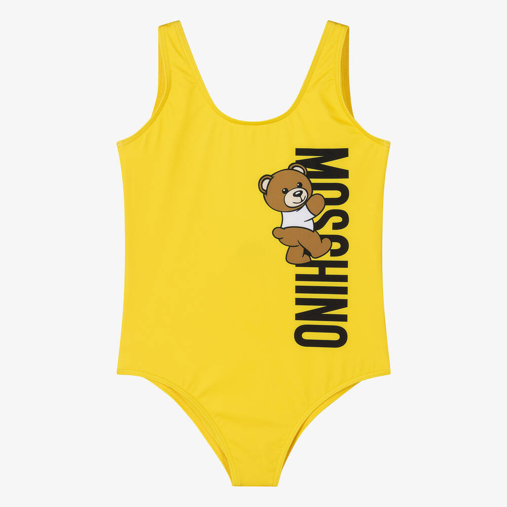 Yellow swimsuit for teen girls by luxury brand Moschino Kid-Teen. For a bold designer look, it has a statement Moschino Teddy Bear logo printed down one side. Soft and stretchy with a cool scoop back, this contemporary swimsuit is a standout look for the beach or the swimming pool.