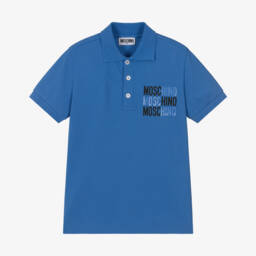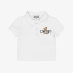 White polo shirt for teen boys by Italian brand Moschino Kid-Teen, with red and blue sailing boats printed on the front for a nautical feel. Made in soft cotton piqué, this classic polo has a navy blue collar matching the cuffs, and a front button placket. The iconic Moschino Teddy Bear logo features on the front for a signature, sailor-themed finish.