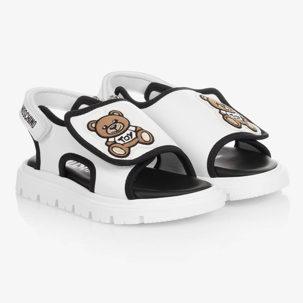 White leather sandals for little boys and girls by luxury Italian brand Moschino Baby, with black trim. Velcro fastening, the front strap has a cute Moschino Teddy Bear appliqué and the ankle strap has a black logo print. Both straps offer an adjustable fit, while the soft leather lining and cushioned insole provide supreme comfort. For a stylish finish, they have a chunky white lug rubber outer sole.
