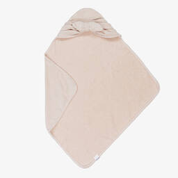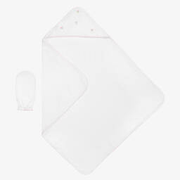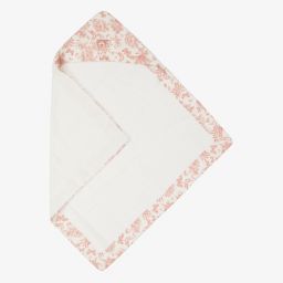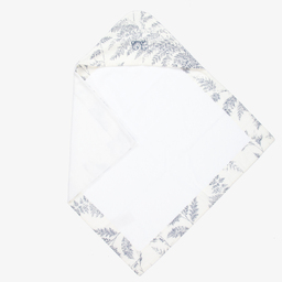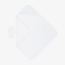 White hooded towel for baby boys and girls by Moschino, made in soft cotton. The outer has a waffle effect design and the reverse is made in soft, absorbent towelling. Ideal for use at bathtime or when at the pool or beach, this versatile towel has cute 3D bear ears on the hood and a beige embroidered logo for a subtle desinger finish.