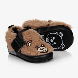 White and gold pre-walkers for baby boys and girls by Italian designer Moschino Baby, made in soft and supple leather for comfortable wear. Distinctly designer, they have the iconic Moschino Teddy Bear appliquéd on the easy-to-use velcro fastening strap. The designer's name is printed on the side, with a further logo print on the flexible outer soles.