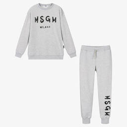 Turquoise blue tracksuit for little boys and girls by MSGM, made in soft cotton jersey with matching white brushstroke logo print. The zip-up top has a cosy hood and front pockets. The joggers have a back pocket and a comfortable elasticated waistband.