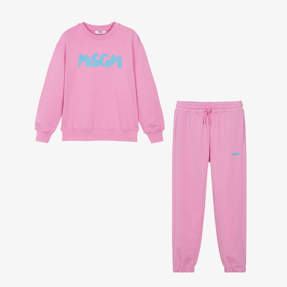 Candy pink tracksuit for boys and girls by MSGM, made in soft cotton jersey. Casual and comfortable with a relaxed fit, both pieces feature contrasting blue brushstroke logos on the front. The joggers have side seam pockets and a drawstring waist for a comfortable fit.