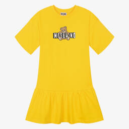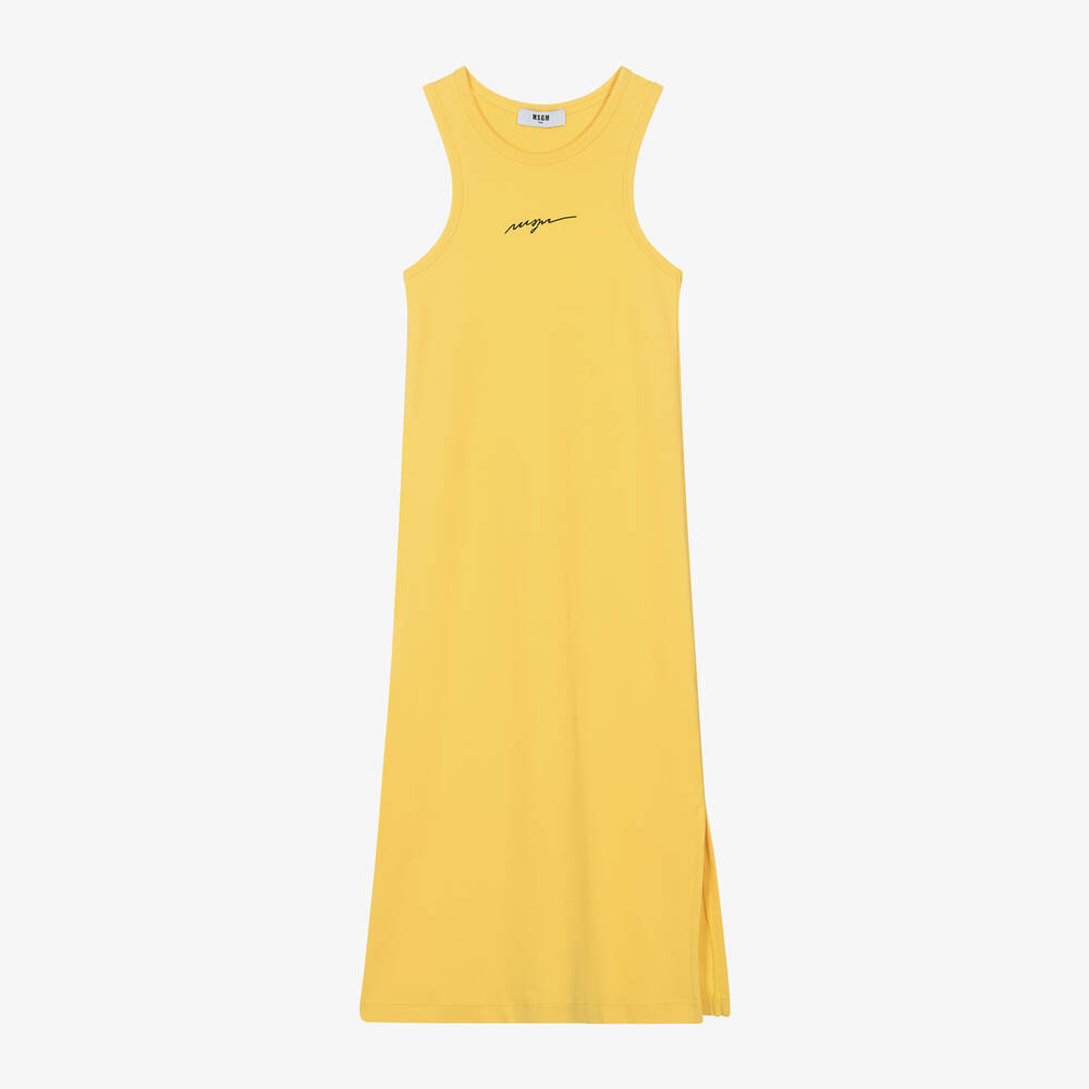 Long bright yellow cotton dress for girls by MSGM, with a black cursive logo embroidered across the chest. Ideal for sunny days, it is made in soft, comfortable jersey, with a vented seam on one side for ease of movement.
