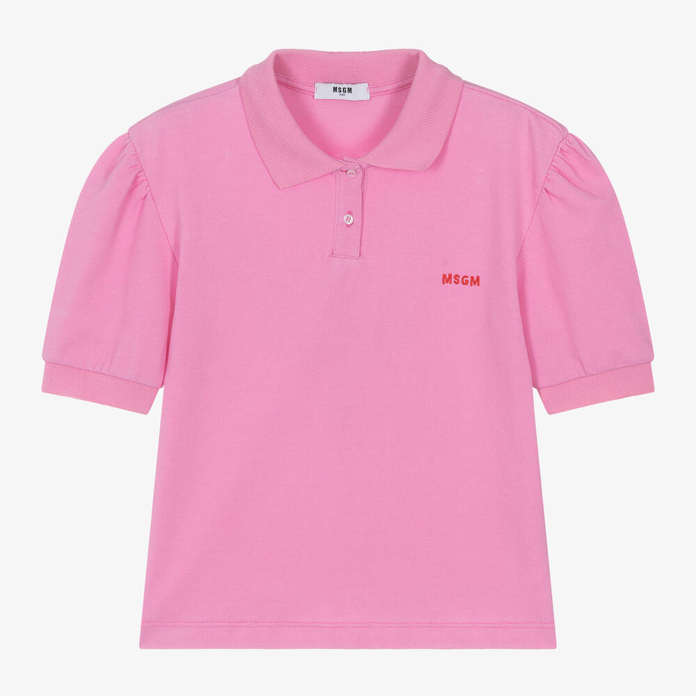 Pink cotton polo shirt for girls by MSGM, made in soft piqué with a red micro logo embroidered on the front. Designed with a ribbed collar and button fastenings, the short sleeves are gathered on the shoulder, adding a contemporary update to this classic style,