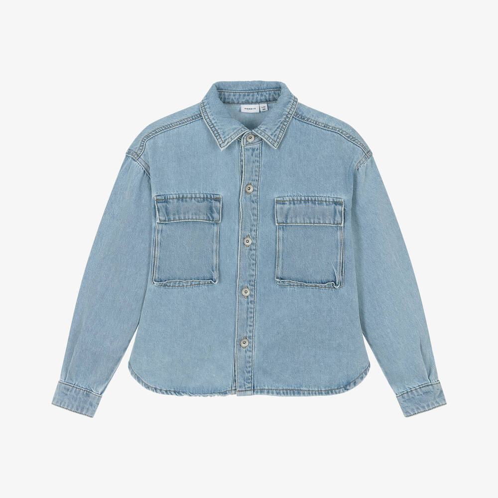 Light blue denim overshirt for older boys, by Danish brand NAME IT. Made from non-stretch cotton, this timeless piece has a collared neckline and branded metal buttons. It has decorative chest pockets and a curved hemline for a more laid-back look.