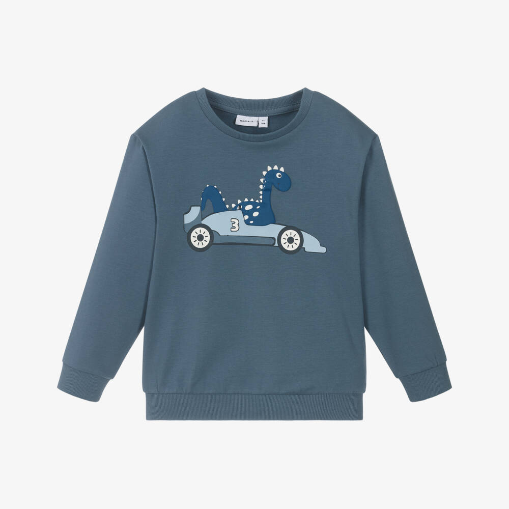 Mid-blue sweatshirt for boys by NAME IT, made in soft organic cotton jersey. A regular fit, this casual sweatshirt has a fun dinosaur car motif on the front for a playful touch.