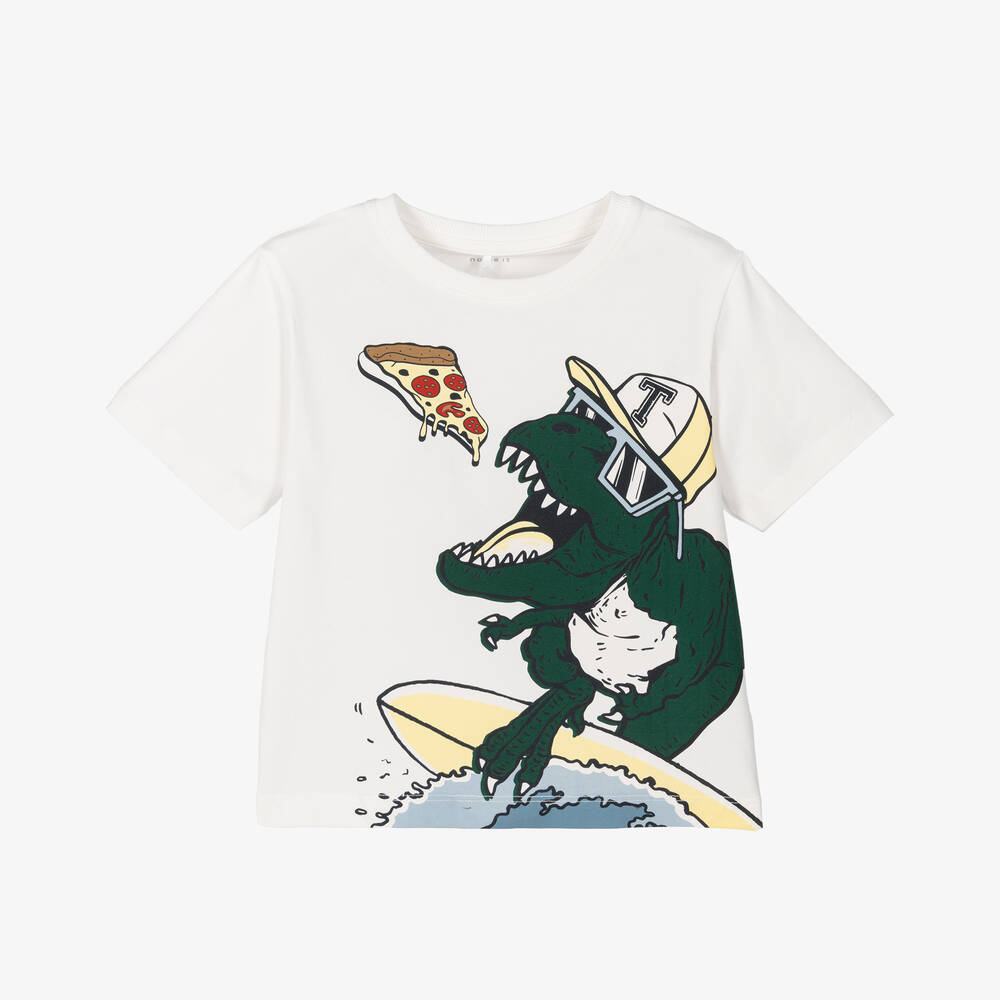 Boys white T-shirt by NAME IT, made in soft organic cotton jersey. This fun tee has a graphic dinosaur printed on the chest eating a slice of pizza.