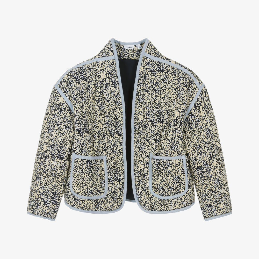 Navy blue jacket for girls by NAME IT, designed with a pastel yellow floral print. This gently padded jacket is made with sustainable viscose and is ideal for layering when it is cold. It has pale blue trims and two front pockets for carrying small essentials.
