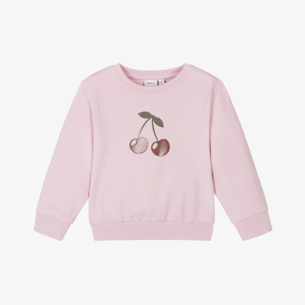 Lilac pink sweatshirt for girls by NAME IT, made in soft organic cotton jersey. Printed with a cute sparkly cherry on the front, this relaxed style is ideal for casual days.