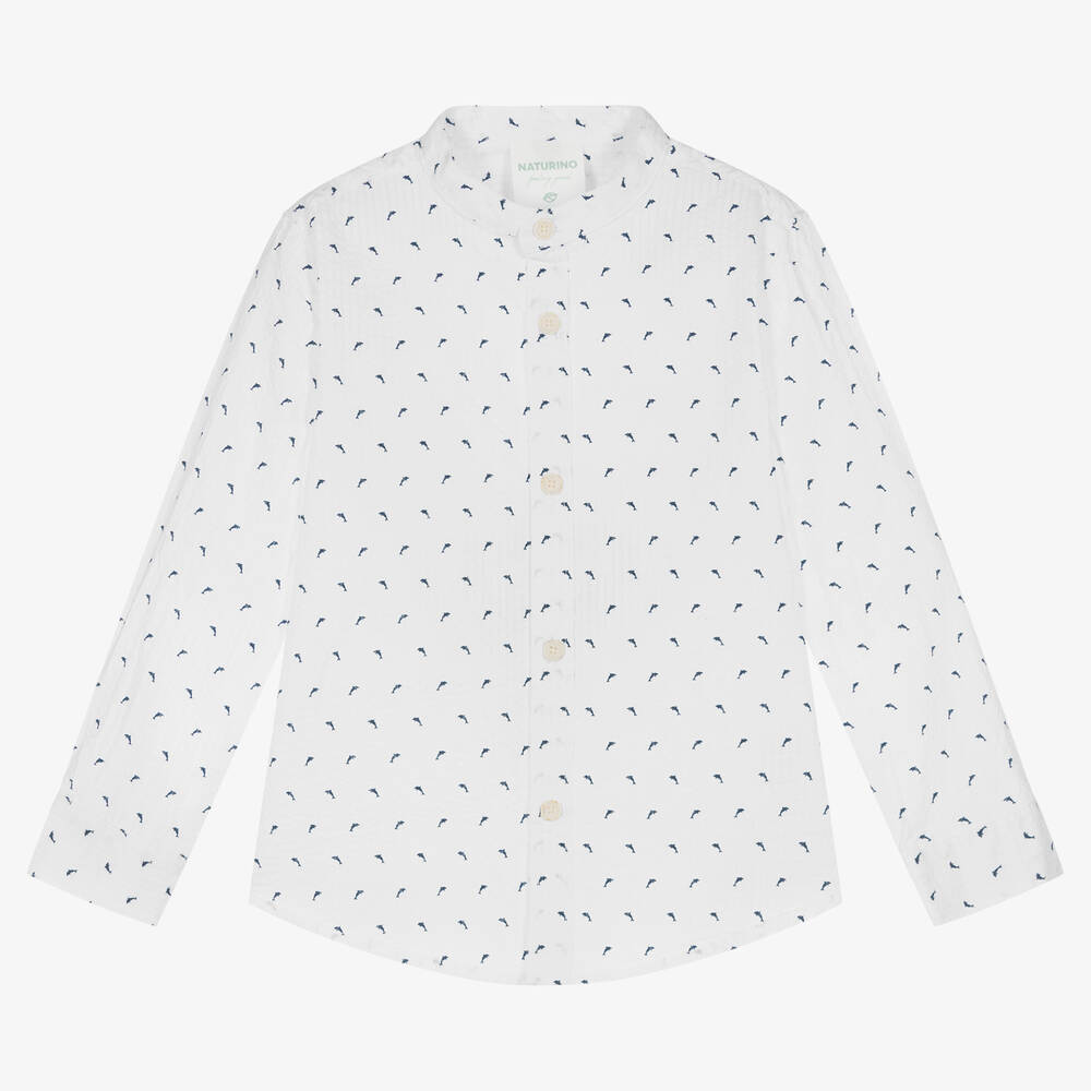 White collarless shirt for boys by Naturino, patterned in tiny navy blue dolphins. Woven in lightweight cotton for comfort, it has a subtle striped pattern within the weave. There are button fastenings down the front and on the cuffs.