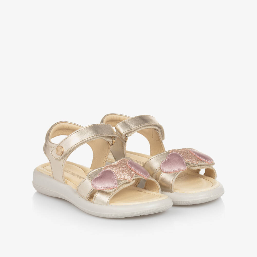 Beautifully comfortable, metallic gold leather sandals for girls by Naturino, handcrafted with metallic and glittery pink heart detail. Soft and supple, with a leather lining and breathable, cushioned insole, they fasten easily with velcro straps for an adjustable fit. A flexible, non-slip rubber outsole completes the style.