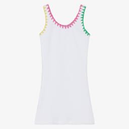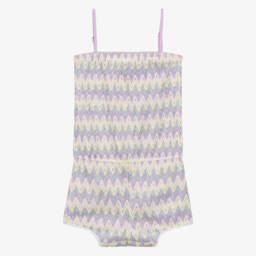 A lovely textured playsuit for girls by Nessi Byrd, with pink, yellow and brown stripes. This stylish resort wear piece is beautifully soft, lightweight and stretchy, ideal for layering over swimwear. The shoulder straps are adjustable for a comfortable fit and the elasticated waistband is trimmed with a beautiful woven tie.