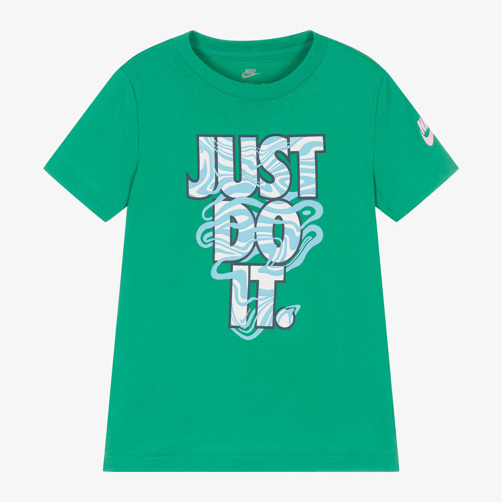 Green crew neck T-shirt for boy from American sports label Nike, made in soft and lightweight cotton blend jersey. A statement 'Just Do It' slogan is printed in white and navy blue on the front with a cool, textured water swirl accent. In addition, there is a pink Swoosh logo printed on the short sleeves.