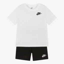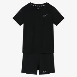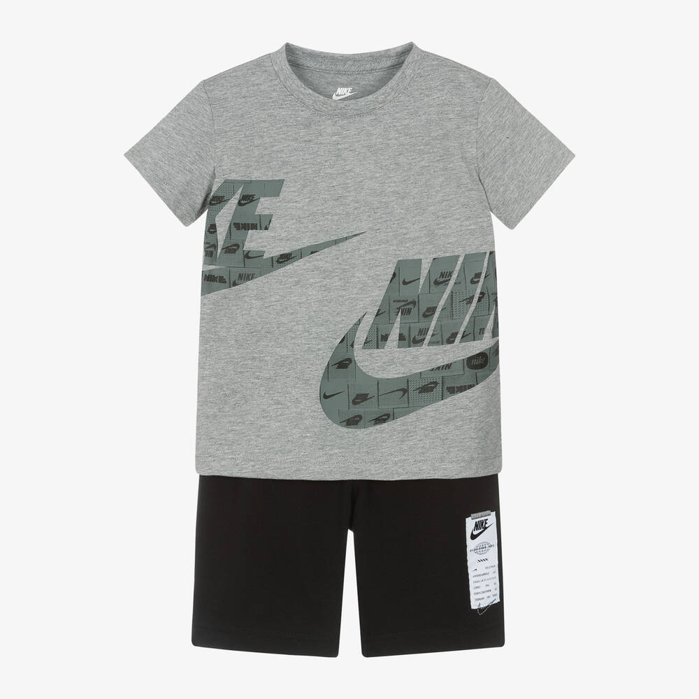 Casual grey marl top and black shorts set for boys by Nike, made in soft cotton-blend jersey. The short-sleeved T-shirt has a large grey logo and Swoosh design on the front, featuring smaller black logos for an unmistakable branded look. The black shorts are made in mid-weight, loop-back jersey with a comfortable elasticated waistband. They are finished with a utility-style logo patch on the front.