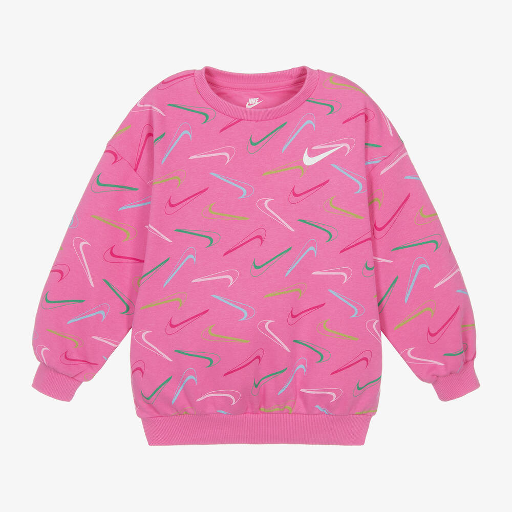 A pink sweatshirt for girls from American label Nike. Designed in an oversized fit with dropped shoulders, this soft cotton-mix sweatshirt has long sleeves, ribbed edges for comfort, and the famous Swoosh motif in a green, blue and white colourway.