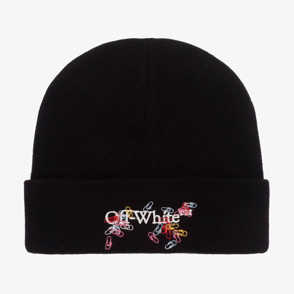 This black beanie for girls from Off-White is sure to complement her favourite streetwear look. Luxuriously soft, this Italian-crafted hat is knitted in pure cotton for lasting comfort. Intricately embroidered on the brim is the label's white logo, with scattered paperclips stitched in vibrant pink, red, yellow and blue to add an unexpected splash of colour to this monochrome accessory.