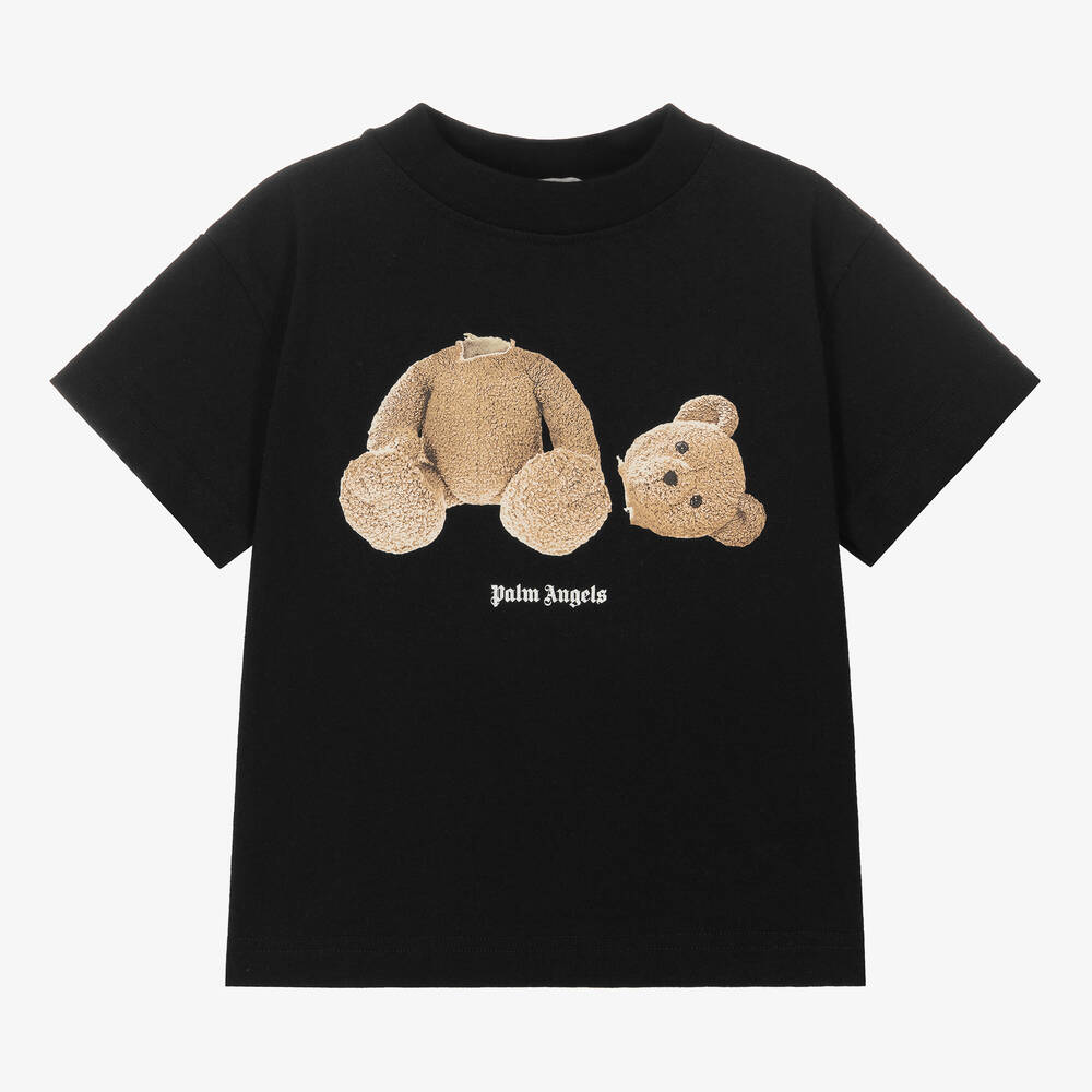 Classic black T-shirt for boys and girls by luxury Italian fashion brand Palm Angels, made in soft cotton jersey. This iconic piece features the brand's distinct Bear graphic print on the front, alongside the bold Palm Angels logo. In a relaxed fit, it has short sleeves and a ribbed neckline for comfort.