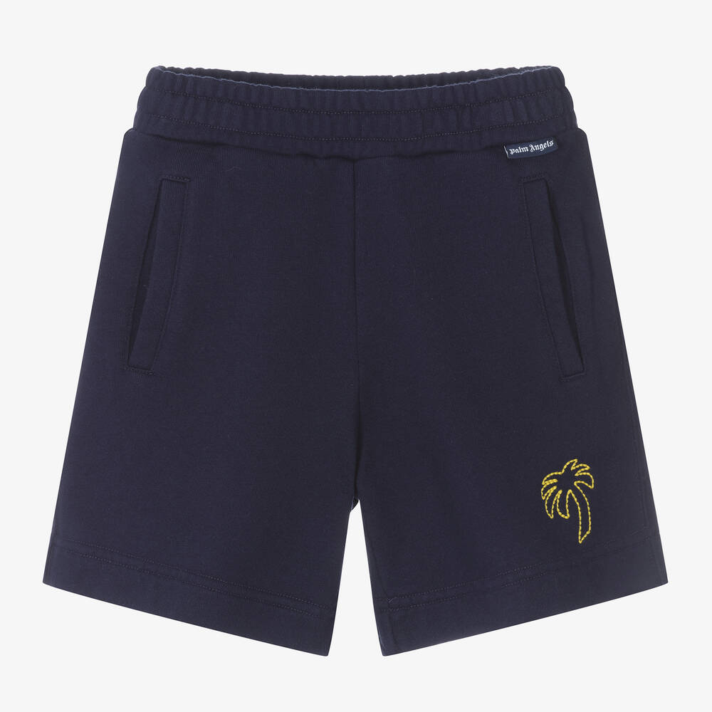 Cool navy blue shorts for boys by Palm Angels, made from soft mid-weight cotton jersey. For an added designer touch, they have a vibrant yellow palm tree motif stitched on one side, iconic to the brand. Casually styled, there are handy welt pockets on the front and an elasticated waist for a comfortable fit.