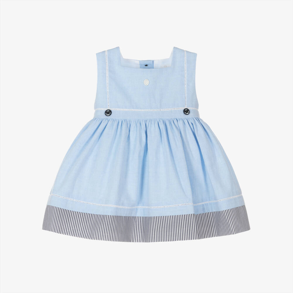 Delightful blue dress for baby girls by Patachou, woven in soft Oxford cotton with delicate ladder lace trims. This sleeveless style is decorated with navy blue nautical-themed button trims on the front and has a navy blue striped hemline. Fully lined in lightweight cotton for added comfort, it fastens with matching buttons on the back.