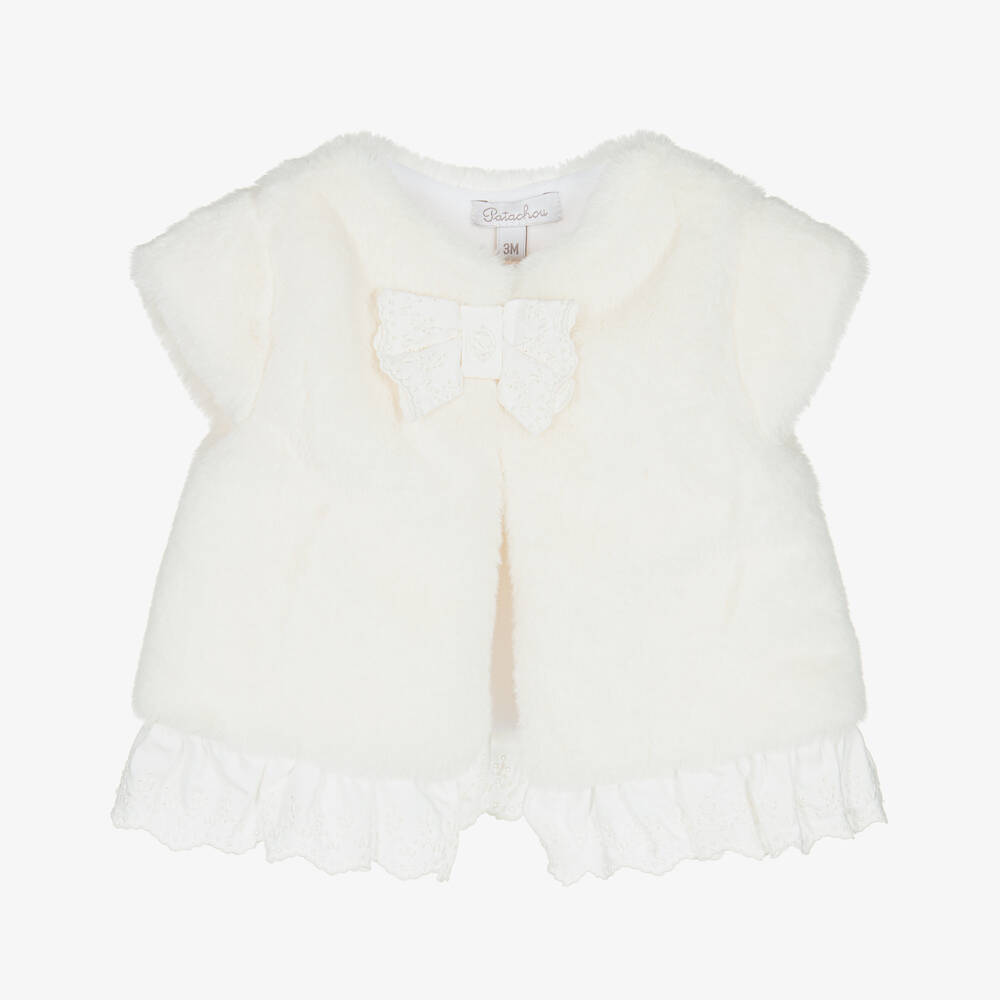 Cute and cosy for baby girls, this ivory faux fur gilet is from Portuguese brand, Patachou. Fully lined with soft fleece for added warmth and comfort, it has a popper fastening on the front concealed beneath a pretty embroidered bow and logo charm. To complete the look the gilet has a ruffled cotton twill hem with lovely embroidered detail and scalloped edging.