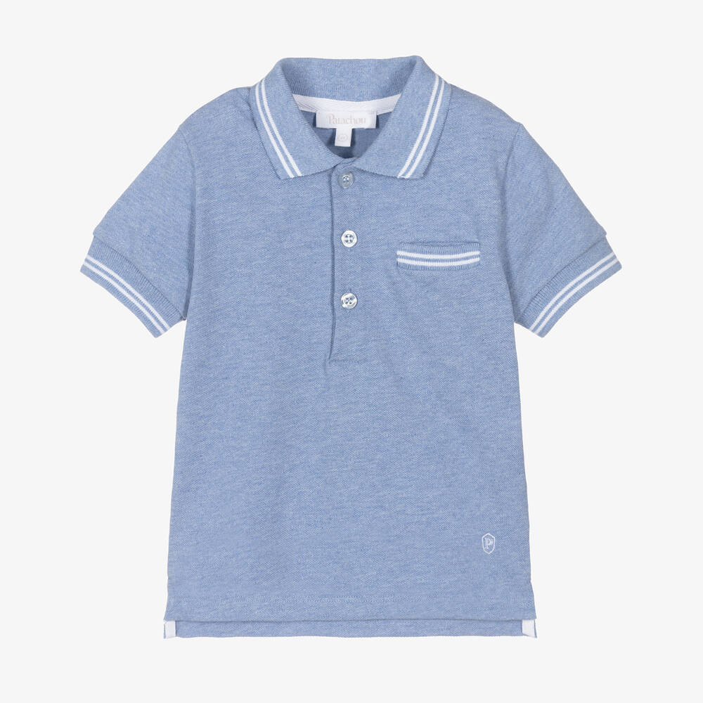 A blue polo shirt for boys by Patachou, made in soft and stretchy cotton piqué. Fastening with buttons on the front, it features white striped trims, a chest pocket and a slightly longer back hem.