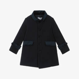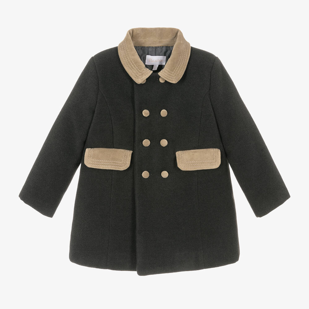 Ideal for the cooler weather, this smart charcoal grey coat for boys is by Patachou. Soft and felted with a silky smooth lining, it has contrasting beige velvet trims on the pointed collar, flap pockets, and double-breasted fabric-covered button fastenings for a classic look.