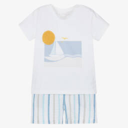 A charming cotton shorts set for boys by Patachou, in white with colourful stripes. The button-up piqué polo shirt has a logo embroidered chest pocket and coordinating trims. Lightweight and fully lined, the striped woven shorts fasten with a button and zip on the front.