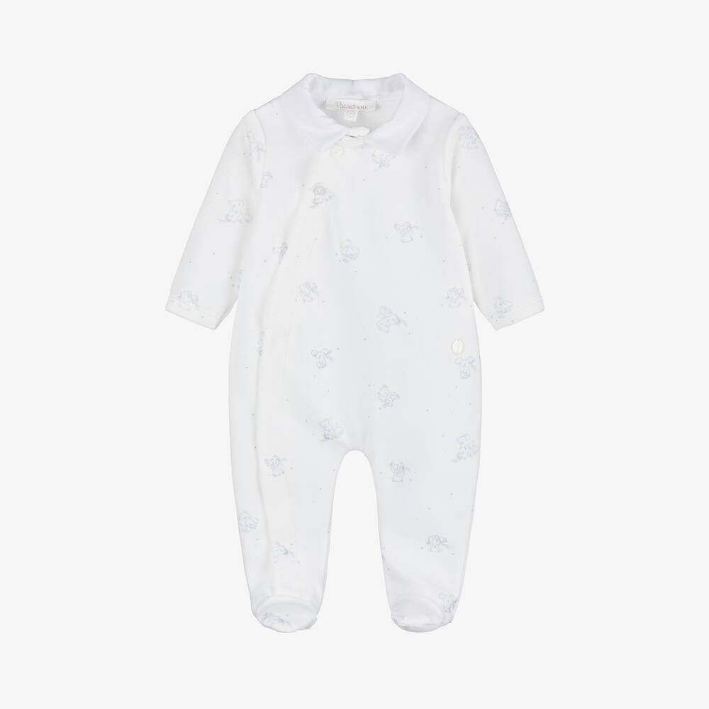 Lovely white babygrow for boys by Patachou, made in super soft velour for gentle comfort against the skin. Patterned with adorable blue teddy bears, this one-piece fastens with poppers on the front. The pointed twill collar completes the babysuit with a traditional touch.