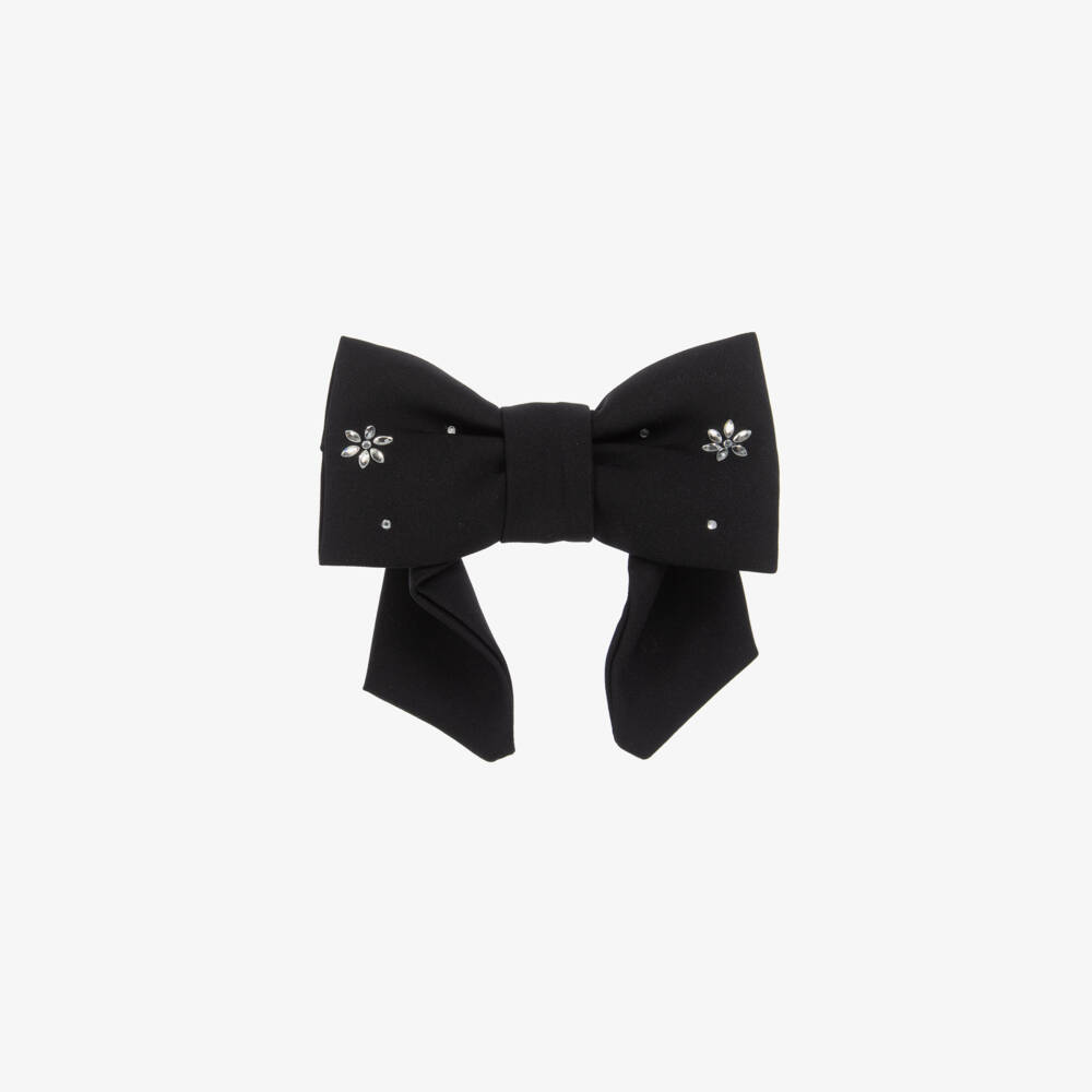 Exclusive to Childrensalon, a black hair clip for girls by Patachou. There is an oversized crêpe bow decorated with floral diamantés set on a metal crocodile clip to keep it secure in the hair. This lovely accessory is an ideal finishing touch to a special outfit.