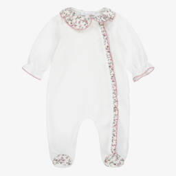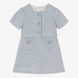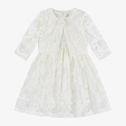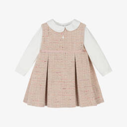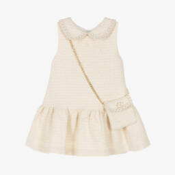 Exclusive to Childrensalon, a lovely ivory tweed dress and jacket set for girls by Patachou, highlighted with shiny threads. Classically styled, the sleeveless dress has a gentle A-line shape and is fully lined for comfort. It has two patch pockets on the front trimmed with 3D chiffon flowers and fastens neatly on the back with a concealed zip. The matching jacket has short sleeves and popper fastenings on the front trimmed with matching chiffon flowers.