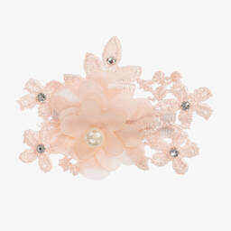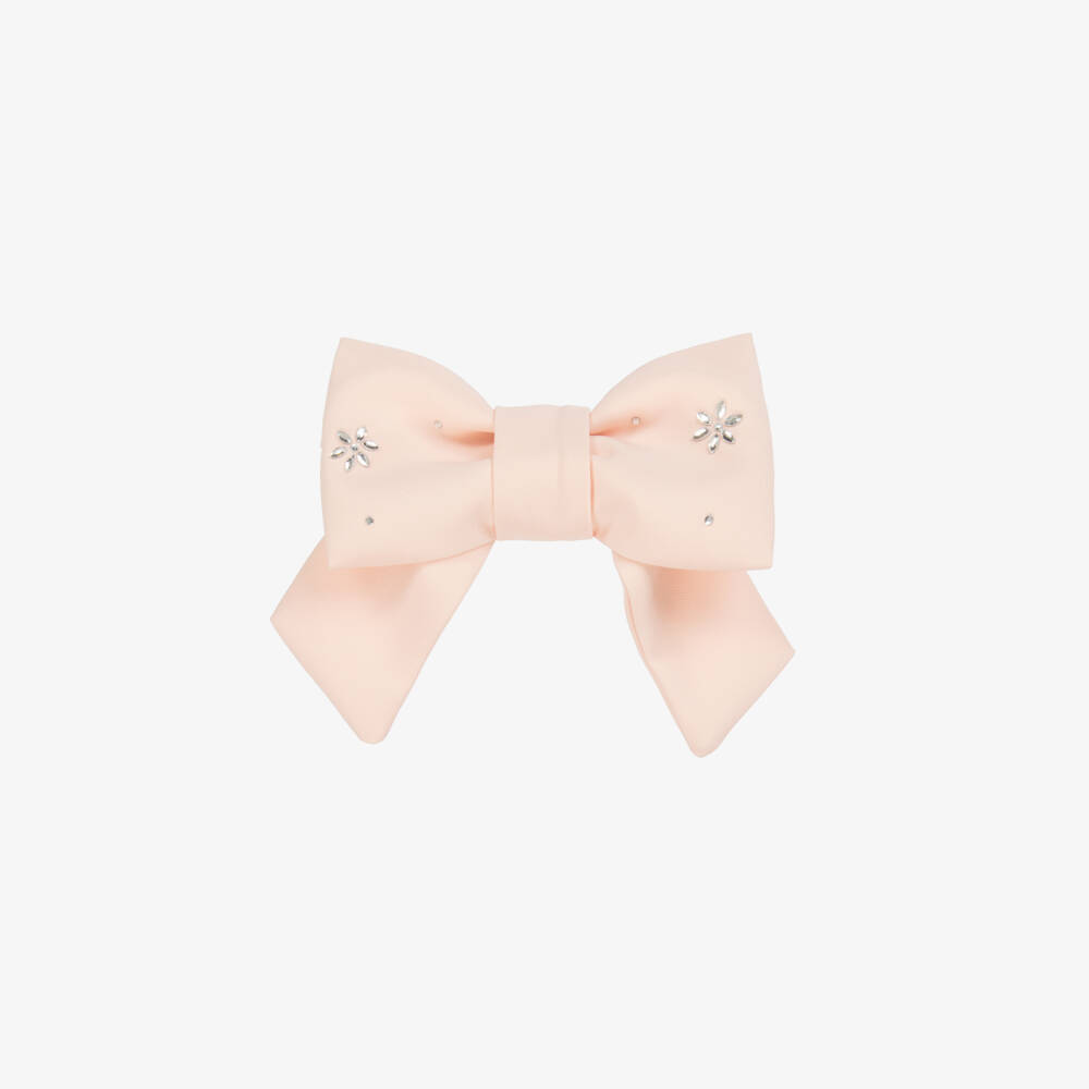 Exclusive to Childrensalon, a pale pink hair clip for girls by Patachou. There is an oversized crêpe bow decorated with floral diamantés set on a metal crocodile clip to keep it secure in the hair. This lovely accessory is an ideal finishing touch to a special outfit.