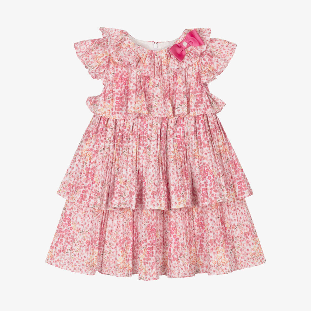 Exclusive to Childrensalon, a beautiful pink floral dress for girls by Patachou, woven in finely pleated cotton. Lovely for a special occasion, this tiered style has a pretty ruffle collar, trimmed with a pink grosgrain bow and logo charm for a sweet designer touch. It is lined in lightweight voile and fastens neatly with a concealed zip on the back.