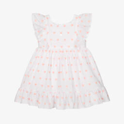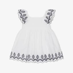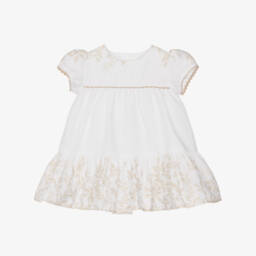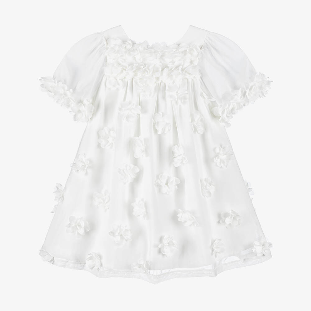 Beautiful white chiffon special occasion dress for girls by classic brand Patachou, embellished with 3D flowers. Fully lined in a double layer of comfortable voile, it has sheer sleeves and a discreet, concealed zip around the back.