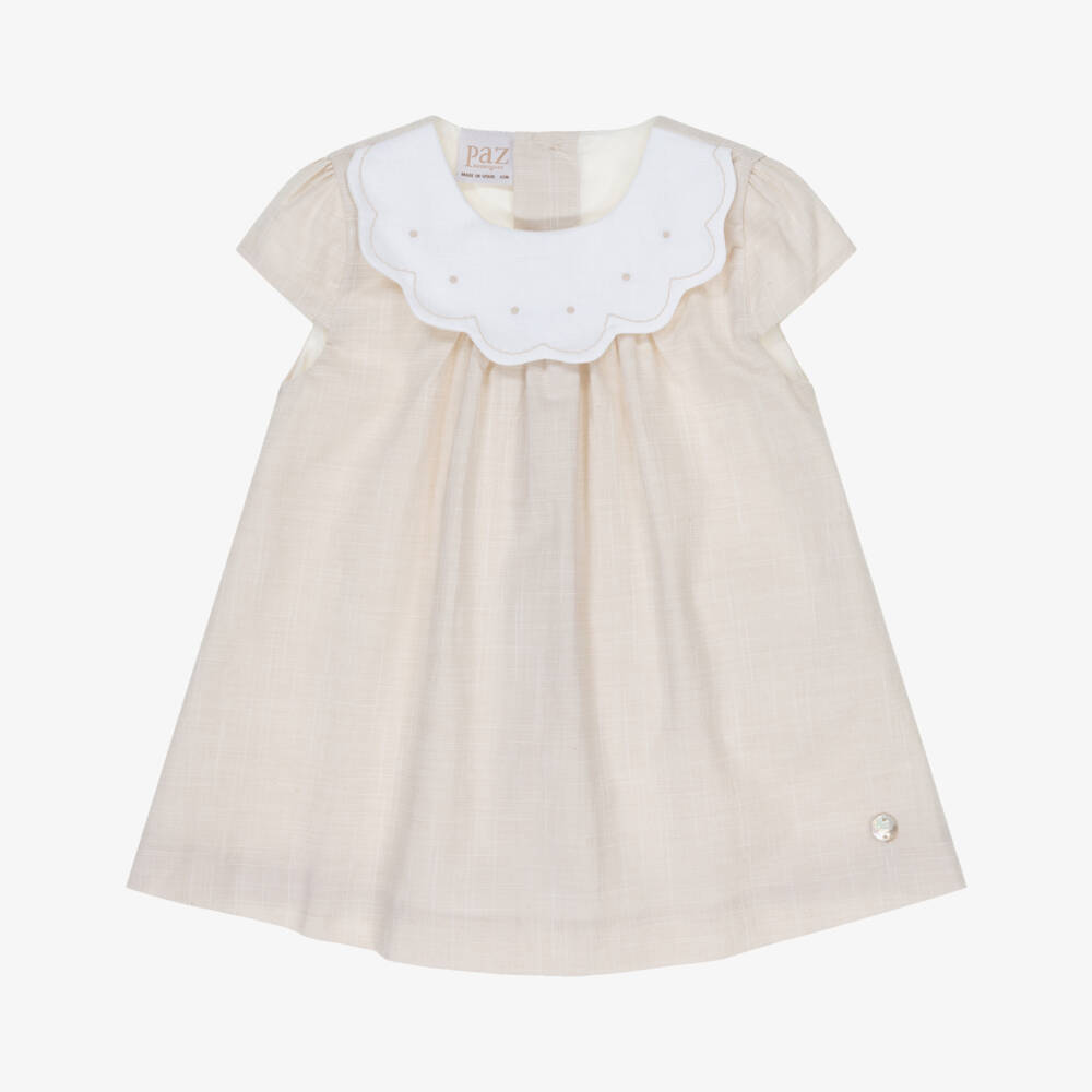 Adorable beige cotton dress for baby girls by classic brand Paz Rodriguez, with the look of linen. It has a sweet, scalloped ivory collar with beige embroidery and capped sleeves. Fully lined in voile for comfort, it comes with useful bloomers.