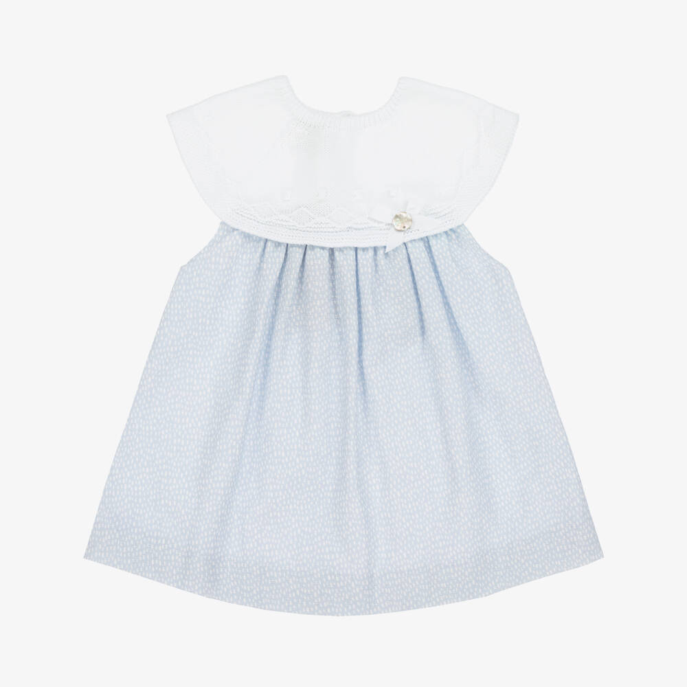 Lovely blue and white dress for baby girls by Paz Rodríguez. The dress is made in textured cotton and has a white knitted bodice with a pretty bow and mother-of-pearl logo charm on the front. Fully lined, it fastens with buttons on the back. It comes with a matching pair of knickers to complete the look.