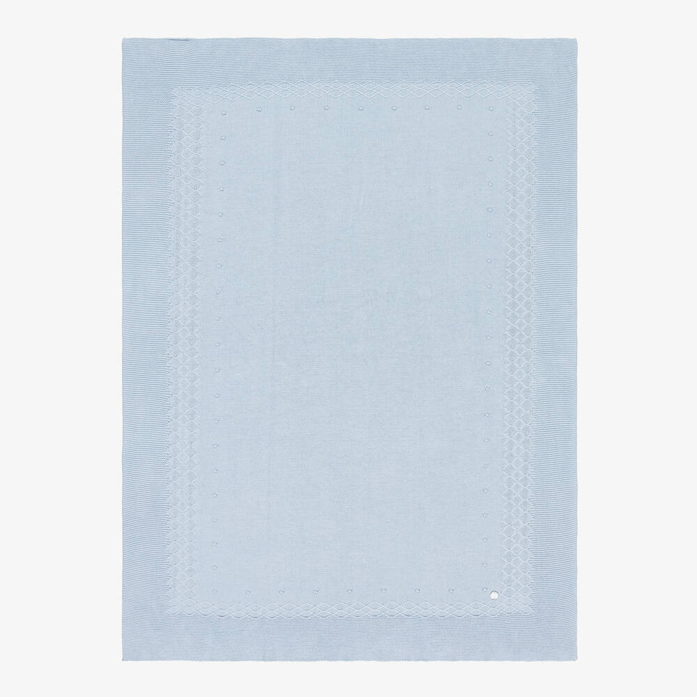 Lovely blue blanket for boys and girls by Paz Rodríguez, knitted in soft cotton. Gentle against delicate skin, it is patterned with embroidered diamond and bobble details on the front and has a mother-of-pearl logo disc in one corner. This lovely accessory is ideal for use in the nursery or when out and about in the pram or car seat.
