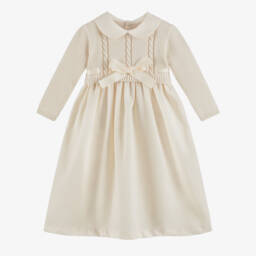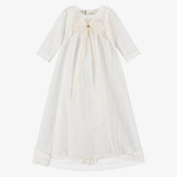 Traditionally styled ivory ceremony gown for baby boys and girls by Paz Rodríguez, made in soft and lightweight plumeti cotton. Fully lined for comfort, it has neat pintucks, lace trims and a ribbon bow on the front. It has a lovely scalloped hem with pretty cutwork floral detailing and a mother-of-pearl logo charm on the bodice. It fastens on the back with matching, branded buttons.