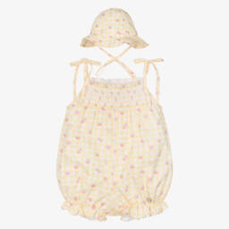 In a neutral shade of ivory, this two piece babygrow for girls by Paz Rodriguez, is knitted with extra fine Merino wool for softness and comfort. The long-sleeved top has a pretty lace collar, scalloped trims and textured purl stitch detailing in dusky pink. It fastens on the back with buttons and includes the brand's signature mother-of-pearl logo charm and bow on the hem. Easy to pull on, the matching trousers have a comfortable elasticated waist and cosy, enclosed feet.