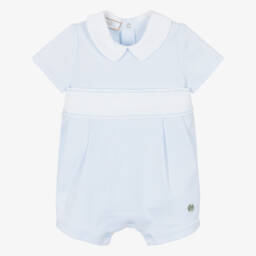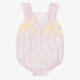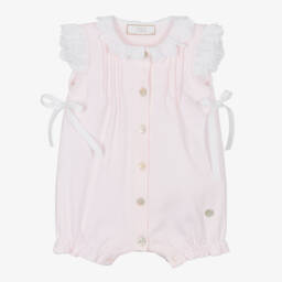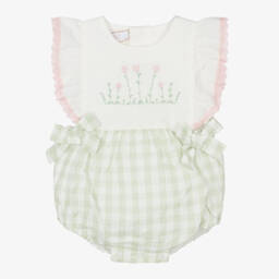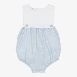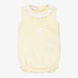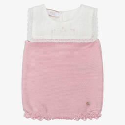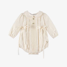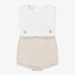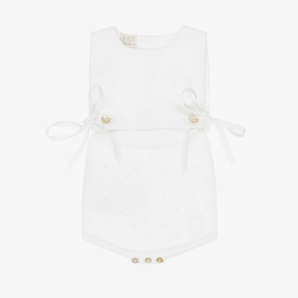 Cute white shortie for baby boys and girls by classic brand Paz Rodriguez, ideal for warm days. Like a tabard, the basket weave top part has open sides and attaches to the shorts in buster suit style with branded, mother-of-pearl buttons and side ribbons that tie in large bows. The knitted shorts have little bobbles on the front and a ribbed waistband, gentle on little tummies.