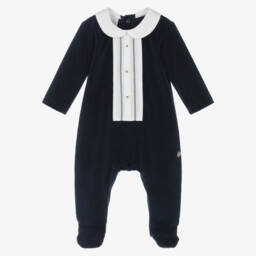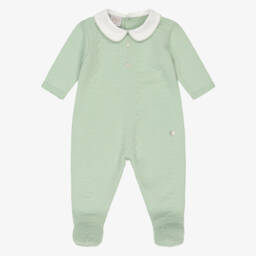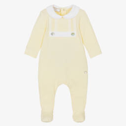 Pale yellow babygrow for boys and girls by classic brand Paz Rodriguez, made in soft, comfortable jersey. It has a white, linen-look overlay on the bodice, with branded, mother-of-pearl button detailing.