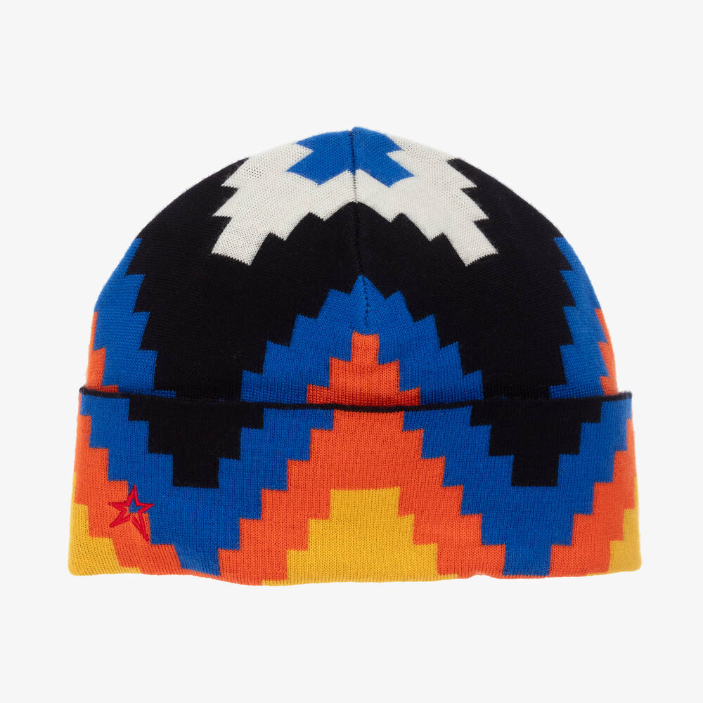 Blue, yellow and orange beanie hat for boys and girls by Perfect Moment, made in extra fine Merino wool. Wonderfully soft and cosy, it has a colourful chevron pattern and turn-up brim. The designer's star logo is embroidered in red on the front for a signature finish.